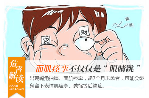 3、晚期恶化:致同侧眼不能睁开,口角向同侧歪斜,无法说话,常因疲倦、精神紧张、自主运动而加剧。